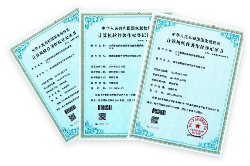我公司擁有自主研發(fā)的多項(xiàng)專利技術(shù)。其中電氣試驗(yàn)設(shè)備類專利四項(xiàng),變壓器類制造專利三項(xiàng),調(diào)壓器制造專利兩項(xiàng),電阻柜專利一項(xiàng),以此為核心技術(shù)開發(fā)出多種新產(chǎn)品。